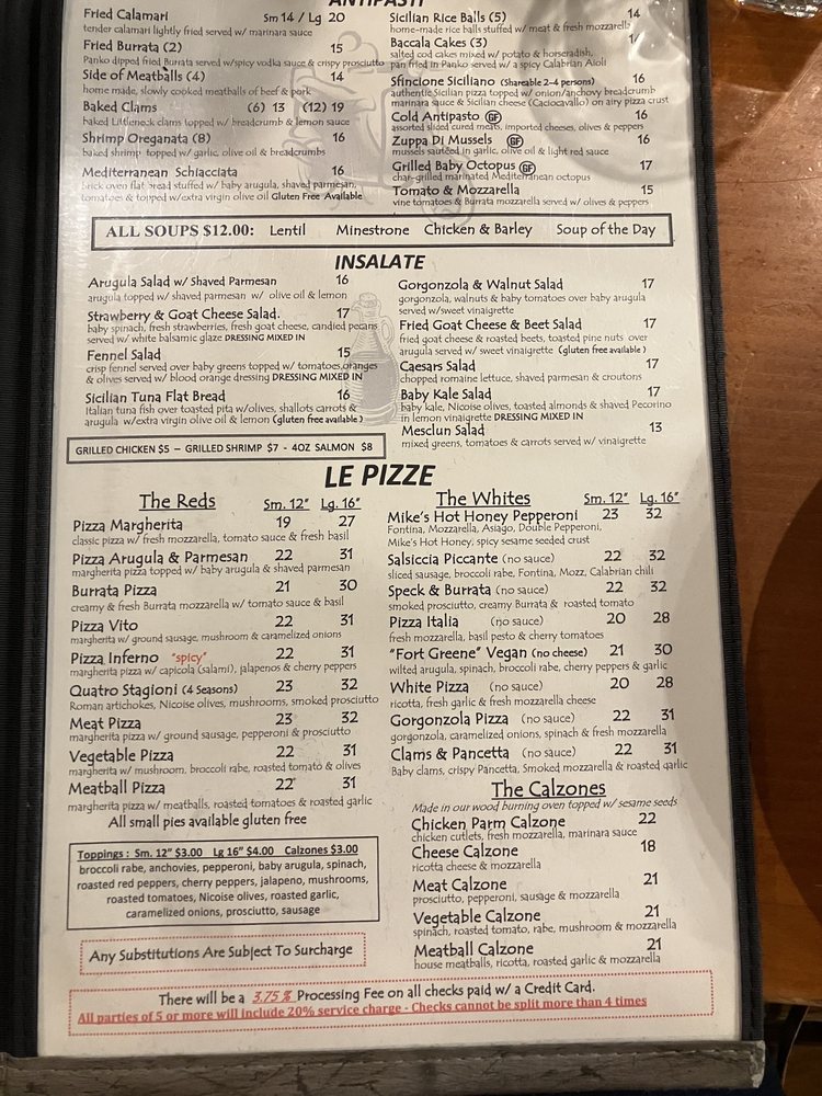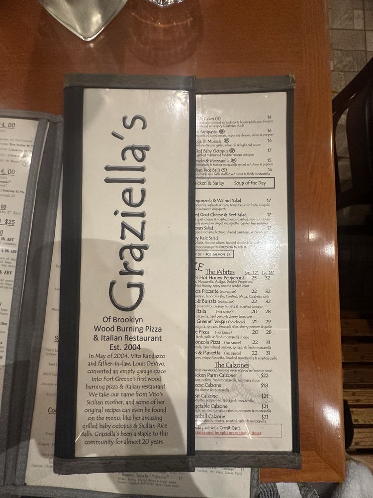 Graziella's in Brooklyn offers a diverse menu with options for everyone. With a casual atmosphere, outdoor seating, and a full bar, it's perfect for groups and families. The appetizers like Fried Calamari and Baked Clams set the tone for a delicious meal. The salads, soups, and entrees like Sea Bass and Squid Ink Seafood Pasta are well-loved by customers. The service is attentive and friendly, making dining here a pleasant experience. The calzones are a standout with flavorful fillings and delicious dough. Overall, Graziella's provides a warm and inviting Italian dining experience that keeps customers coming back for more.